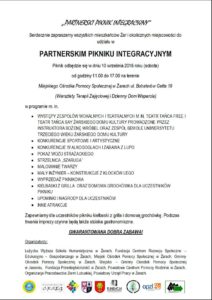 Piknik odbędzie się w dniu 10 września 2016 roku (sobota od godziny 11.00 do 17.00 na terenie Miejskiego Ośrodka Pomocy Społecznej w Żarach ul. Bohaterów Getta 19 (Warsztaty Terapii Zajęciowej i Dzienny Dom Wsparcia).