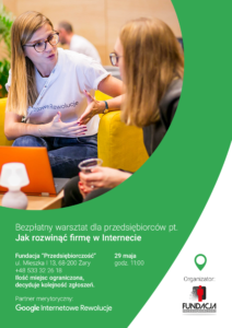 Zapraszamy serdecznie w imieniu partnera merytorycznego na pierwszy warsztat pt: Jak rozwinąć firmę w Internecie ? Już 29.05.2018 roku w siedzibie Fundacji ,,Przedsiębiorczość” sala nr 16, II piętro godz: 11:00 -13.00