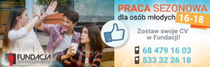 Jeśli jesteś osobą młodą, pełną zapału i chcesz zarobić swoje pierwsze pieniądze w okresie wakacji zapraszamy do siedziby Fundacji. Złożysz CV a my na pewno odezwiemy się z ofertą pracy.