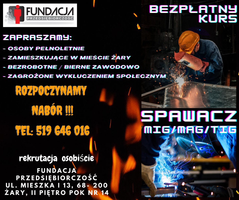 W związku z realizacją projektu Fundacja ,,Przedsiębiorczość” zaprasza do wzięcia udziału w procesie rekrutacyjnym na bezpłatny kurs Spawacza MIG/MAG/TIG Do udziału w projekcie kwalifikują się osoby, które łącznie spełniają poniższe…