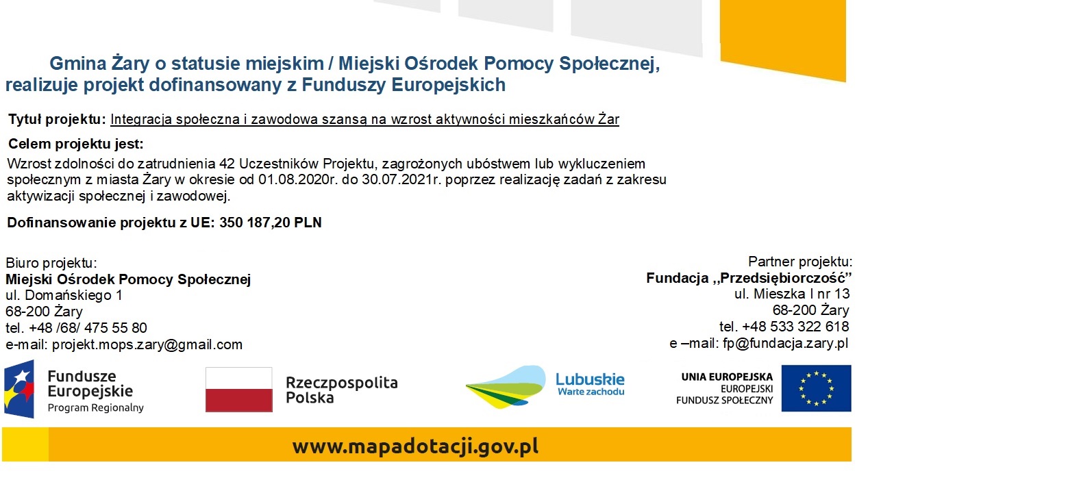 Fundacja ,,Przedsiębiorczość” partner projektu wraz z Miejskim Ośrodkiem Pomocy Społecznej w Żarach liderem projektu informuje, że od 01.08.2020 r. do 30.07.2021 r. będzie realizował projekt konkursowy w ramach Osi priorytetowej…