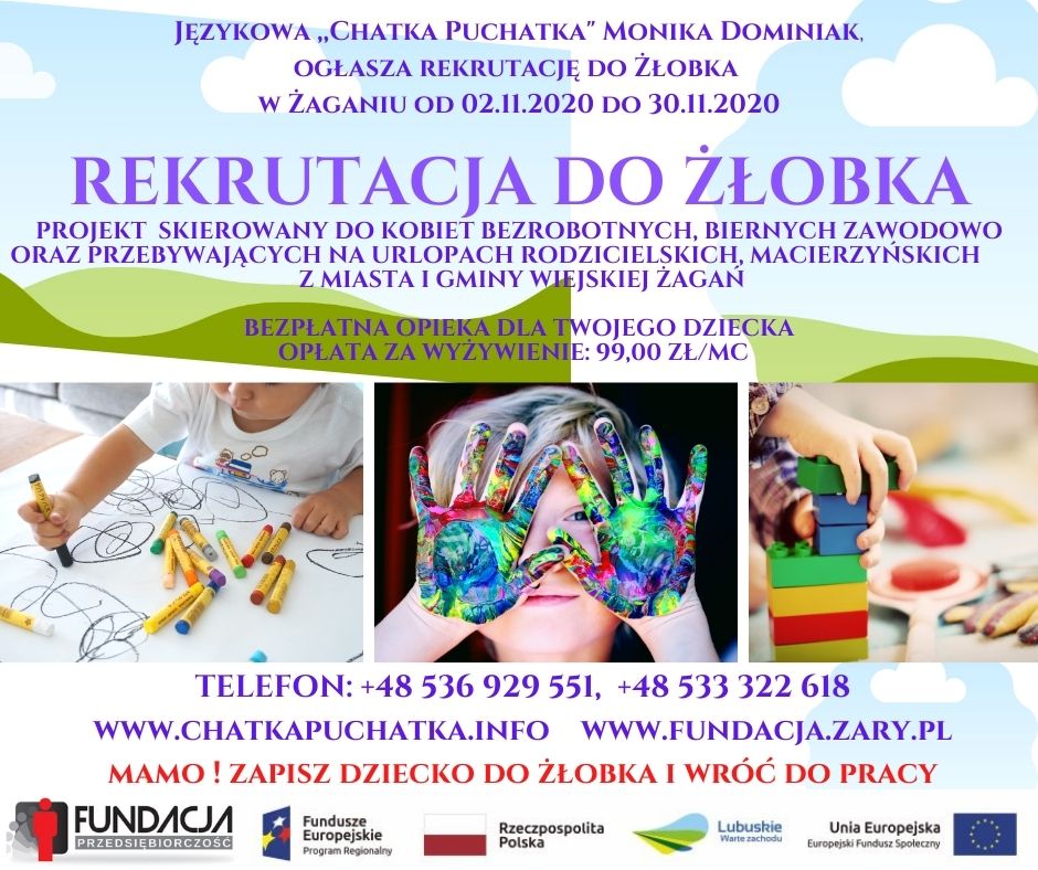 W związku z pozyskaniem dofinansowania w ramach środków Unii Europejskiej, Językowa ,,Chatka Puchatka” Monika Dominiak oraz Fundacja ,,Przedsiębiorczość”, zapraszają do udziału w projekcie nr RPLB.06.04.00-08-0015/20-00 pt: Żłobek w Żaganiu szansą…