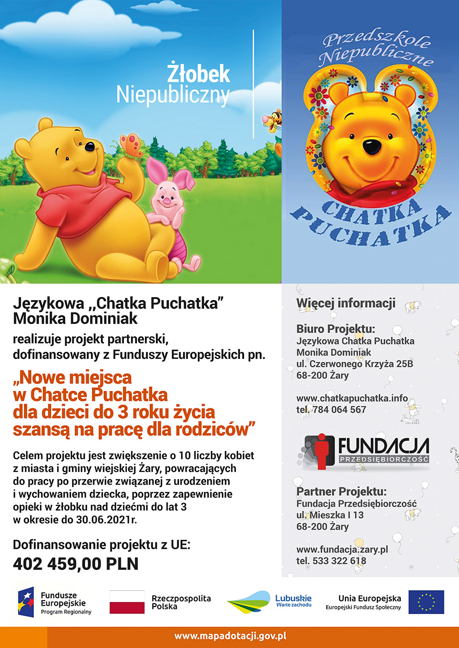Językowa ,,Chatka Puchatka” Monika Dominiak oraz Fundacja ,,Przedsiębiorczość”, zapraszają do udziału w projekcie nr RPLB.06.04-08-0012/18 pt: Nowe miejsca w Chatce Puchatka dla dzieci do 3 roku życia szansą na pracę…
