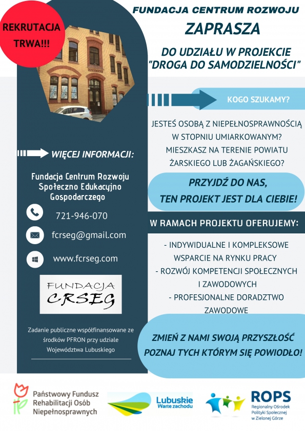 Fundacja Centrum Rozwoju Społeczno-Edukacyjno-Gospodarczego z siedzibą w Żarach zaprasza do udziału w projekcie pn. „Droga do samodzielności”. Projekt polega na rehabilitacji zawodowej i społecznej 20 osób z niepełnosprawnością z terenu powiatu…