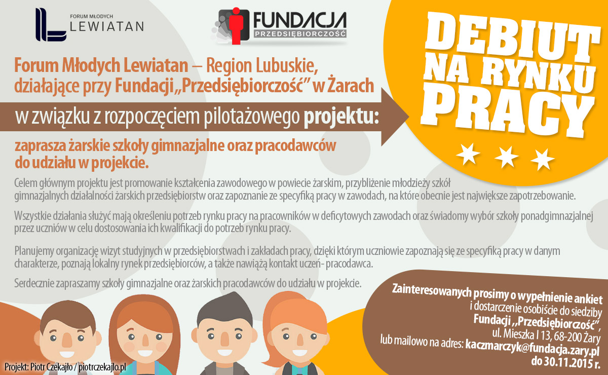 Forum Młodych Lewiatan – Region Lubuskie, działające przy Fundacji „Przedsiębiorczość” w Żarach, w związku z rozpoczęciem pilotażowego projektu „Debiut na rynku pracy” zaprasza żarskie szkoły gimnazjalne oraz pracodawców do udziału…