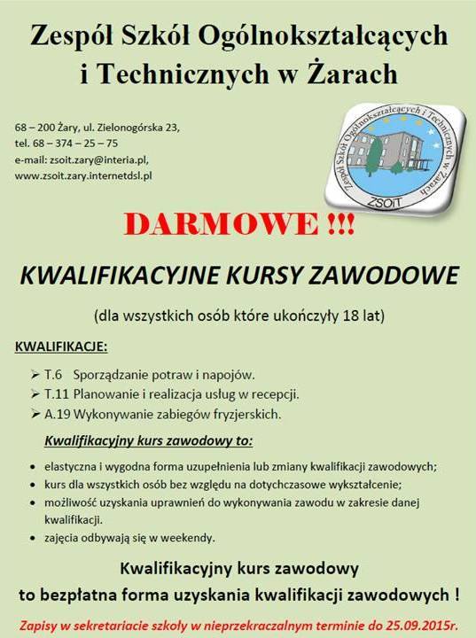 Informujemy o prowadzonym naborze na bezpłatne kursy kwalifikacyjne, skierowane do osób dorosłych, organizowane przez Zespół Szkół Ogólnokształcących i Technicznych w Żarach. KWALIFIKACJE: T.6 Sporządzanie potraw i napojów. T.11 Planowanie i…